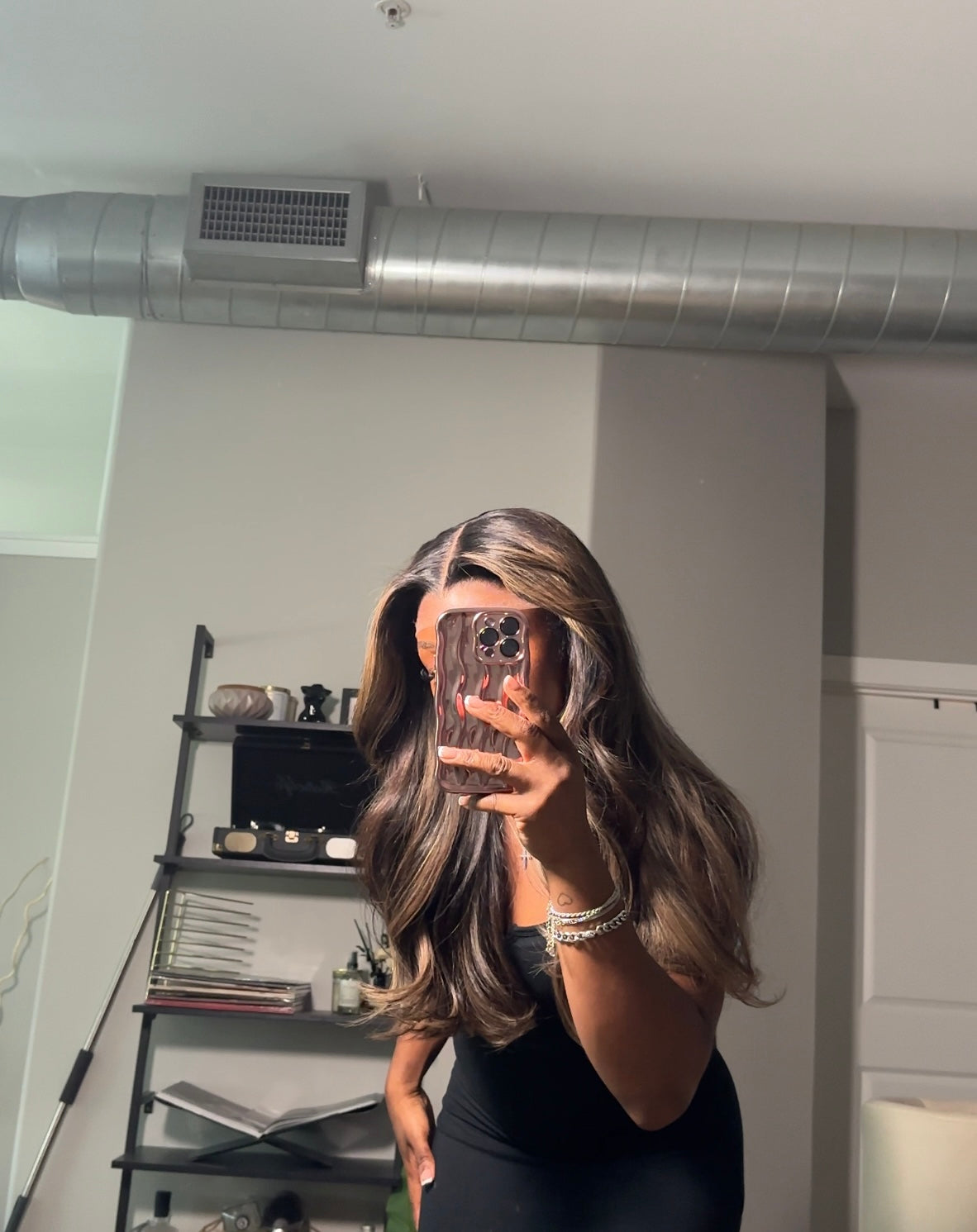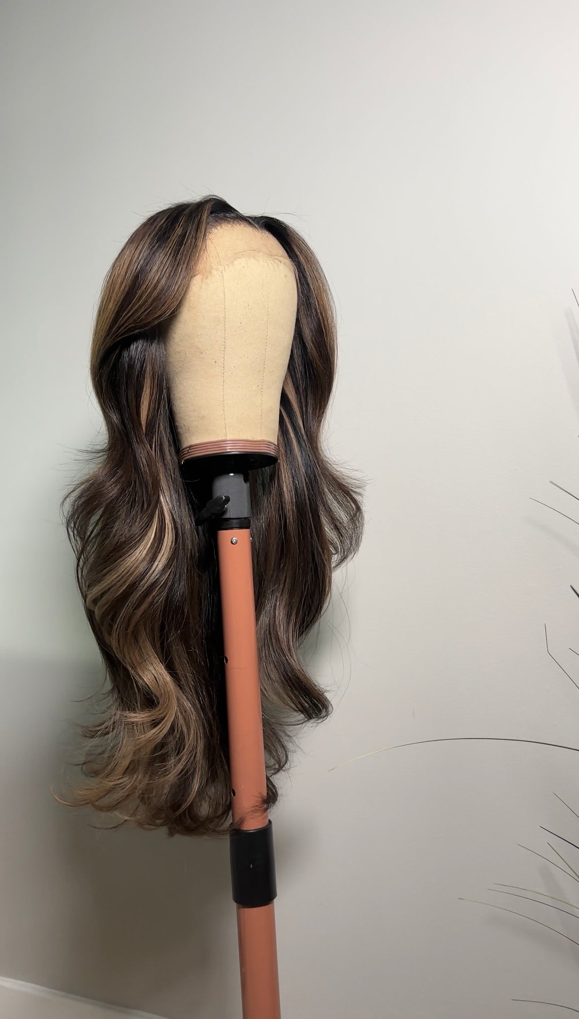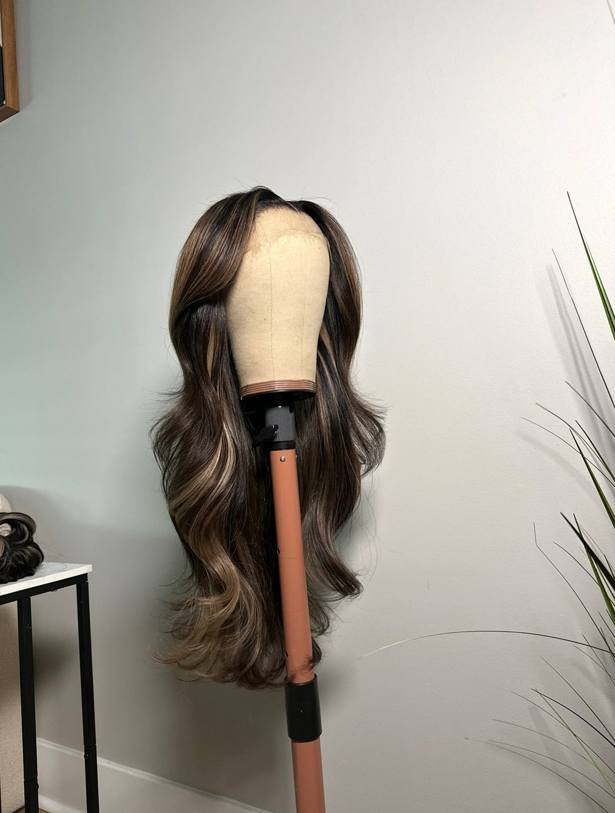 Will arrive in mocha base coloring, with ribbon highlights throughout - curled, layered, and customized (including lace customization, bleaching, and midle-parting) upon shipment.